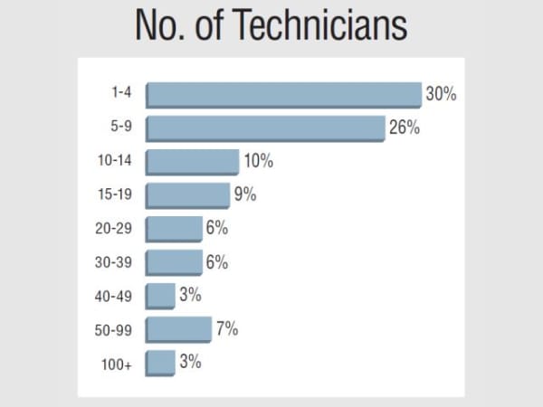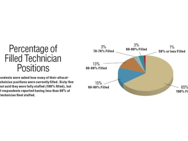 Respondents were asked how many of their allocated technician positions were currently filled. Sixty-five percent said they were fully staffed (100% filled), but 7% of respondents reported having less than 80% of their technician fleet staffed.