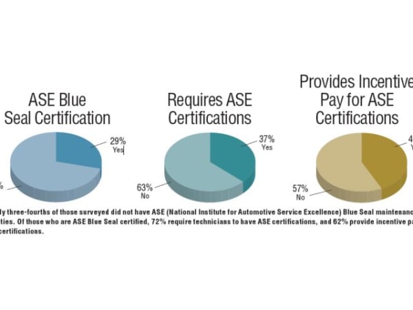 Nearly three-fourths of those surveyed did not have ASE (National Institute for Automotive Service Excellence) Blue Seal maintenance facilities. Of those who are ASE Blue Seal certified, 72% require technicians to have ASE certifications, and 62% provide incentive pay for ASE certifications.