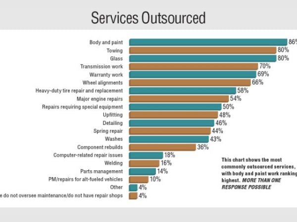 This chart shows the most commonly outsourced services, with body and paint work ranking highest. More than one response possible