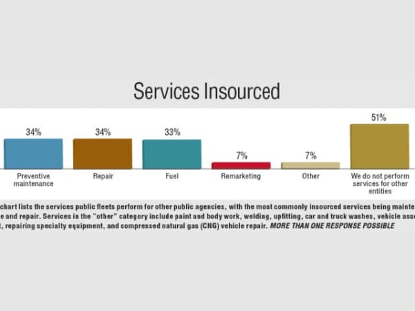 This chart lists the services public fleets perform for other public agencies, with the most commonly insourced services being maintenance and repair. Services in the “other” category include paint and body work, welding, upfitting, car and truck washes, vehicle assessment, repairing specialty equipment, and compressed natural gas (CNG) vehicle repair. More than one response possible