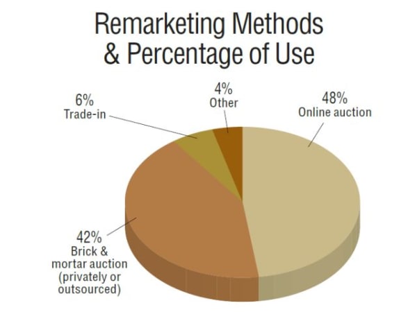 Respondents were asked the percentage of use of various remarketing methods, and the chart above represents the averages of each method used. Online auctions are the most common remarketing method. “Other” methods include sealed bid, donation or sale to other agencies, destruction, lease return, and scrap recycling.