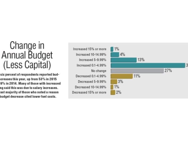 Fifty-six percent of respondents reported budget increases this year, up from 53% in 2015 and 49% in 2014. Many of those with increased funding said this was due to salary increases. The vast majority of those who noted a reason for a budget decrease cited lower fuel costs.