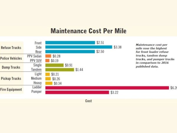 Maintenance cost per mile rose the highest for front loader refuse trucks, tandem dump trucks, and pumper trucks in comparison to 2016 published data.