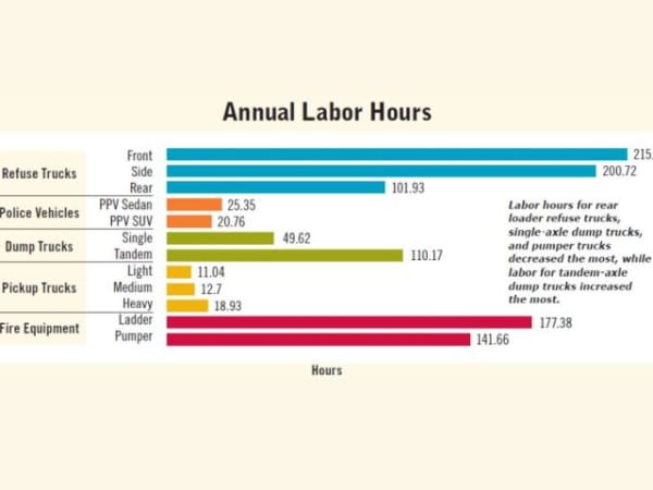 Labor hours for rear loader refuse trucks, single-axle dump trucks, and pumper trucks decreased the most, while labor for tandem-axle dump trucks increased the most.
