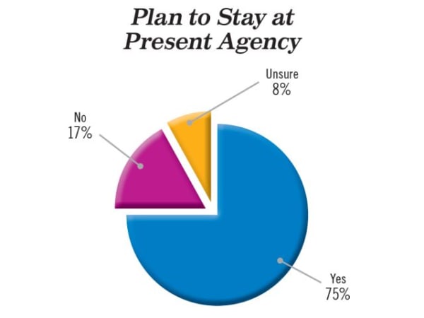 Three-quarters of respondents said they plan to stay at their present agency until they retire or leave the industry.