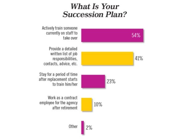 Of those who have a succession plan, the most common succession planning method is training someone currently on staff to take over. Ten percent of respondents said they plan to work as contract employees for their agencies after retirement. Those who said they do not have a succession plan are not included in this chart.