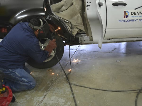 Desi Apodaca, the fleet's welder, is pictured at work on a vehicle.