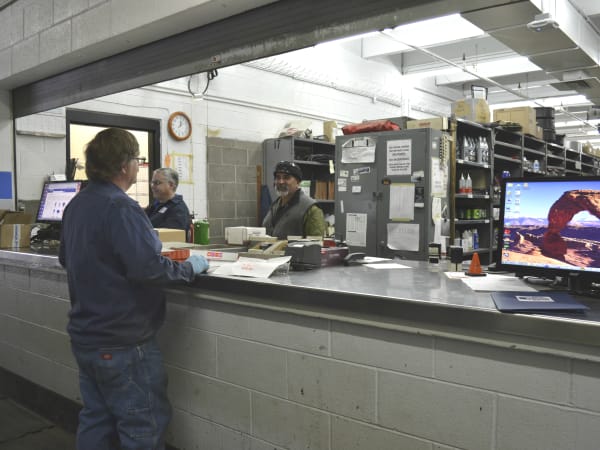 Tommy Phillips is pictured interacting with parts room staff members (l-r) Michael Brosh and Victor Martinez.