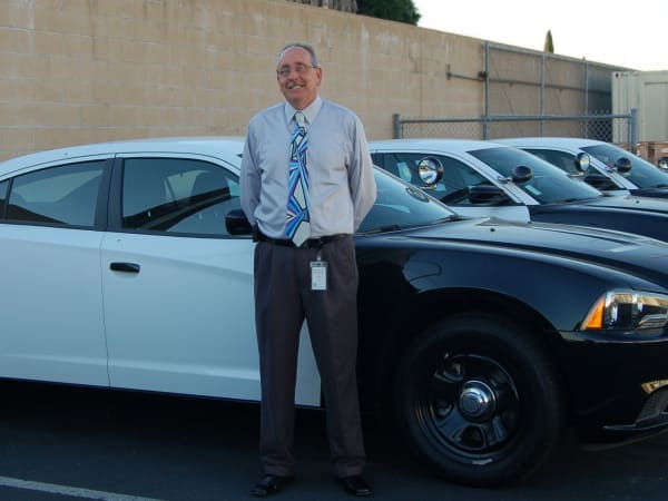 Ron Lindsey began his post as City of Anaheim fleet superintendent in February 2012. Here he stands with three new Dodge Chargers the City is testing out for its police fleet.