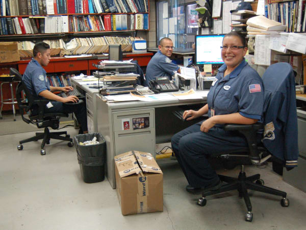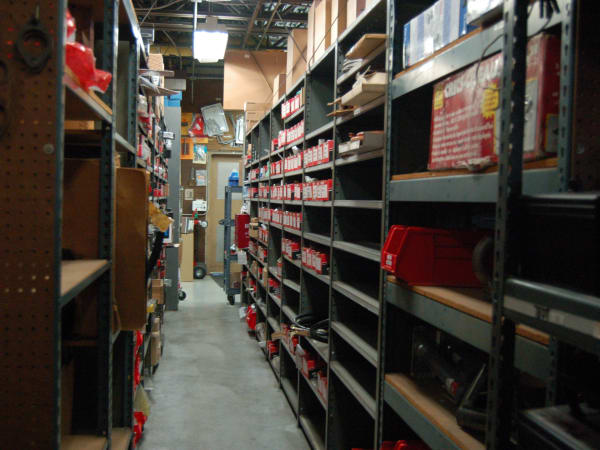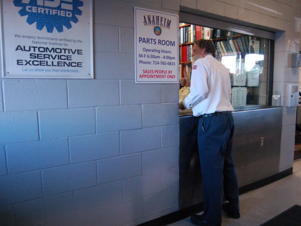 Two windows on opposite ends of the parts room are used for different services. On one side, technicians can request parts; on the other, customers can check out motor pool cars.
