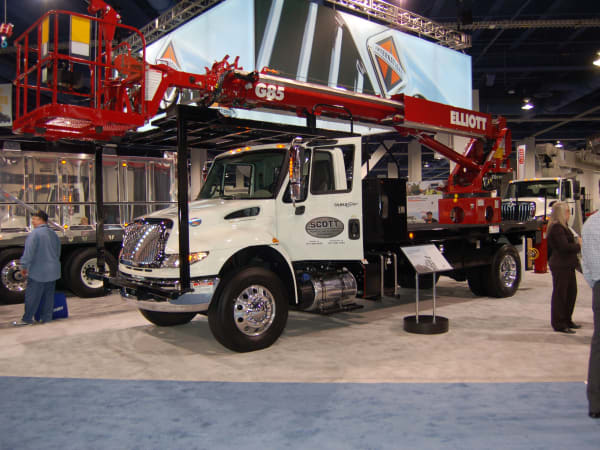 This International DuraStar is upfitted with an Elliott HiReach aerial work platform.