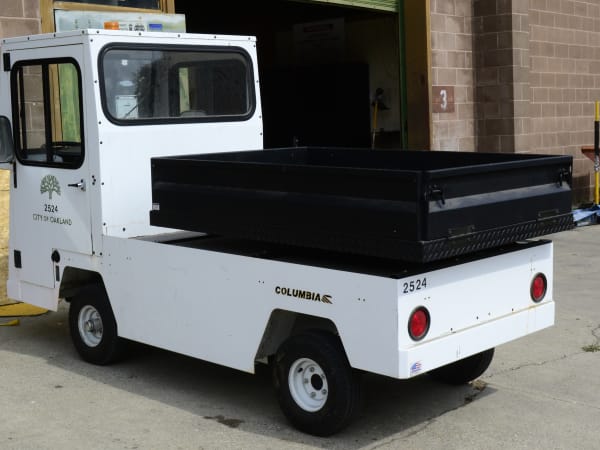 This Columbia Payloader electric vehicle is used around the facilities. It can carry 10 tires at once and was retrofitted to push a stalled vehicle around if needed.