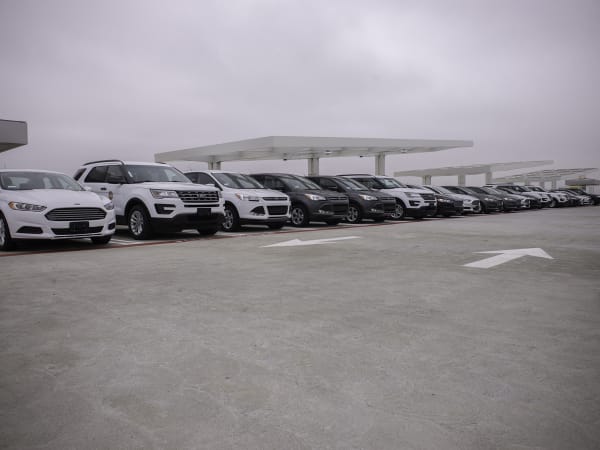 Clearly marked signs show parking spots marked for fleet vehicles.