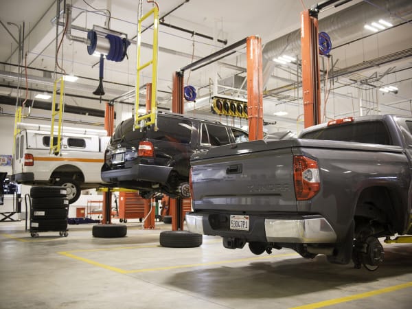 Senior Fleet Technician Kenny Ho lifts a passenger van to perform regularly scheduled preventive maintenance services. Ho is the dedicated technician for the fleet's new one-hour PM program.