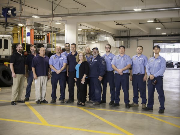 Pictured are fleet staff who work at the new facility, including the day's facility tour guides Brad Northup (far left), John Manring, (third from left), and Sharyl Blackington (center).