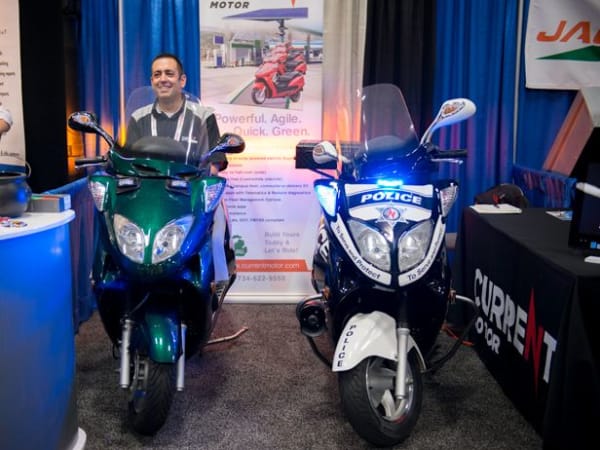 Bob Mossing, VP of fleet sales for Current Motor, shows off the company's electric motorcycles.
