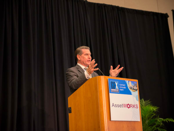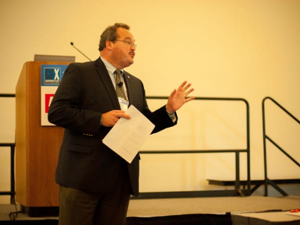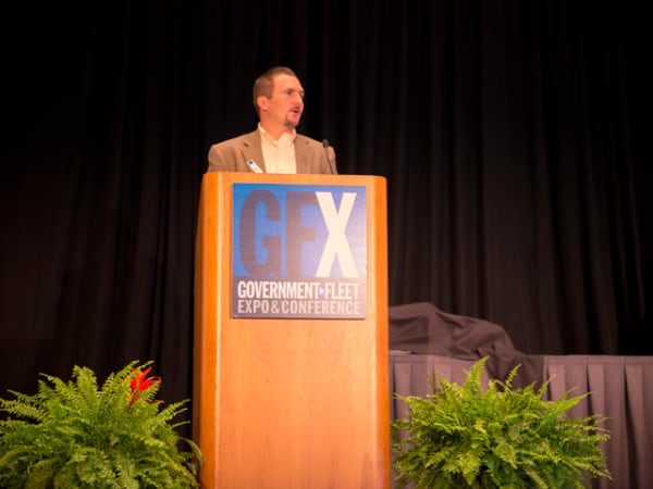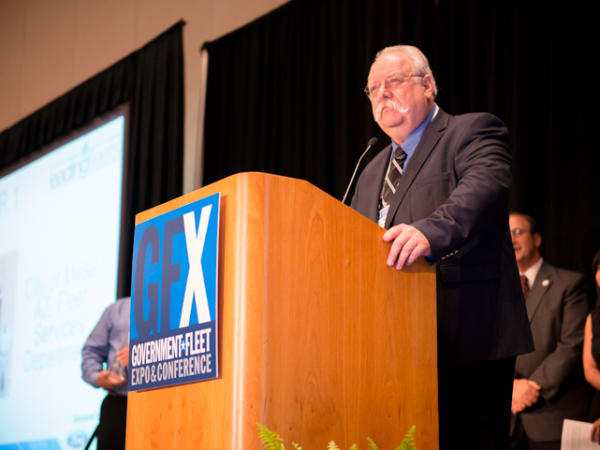 Pete Scarafiotti delivers a speech after learning the City of Mesa, Ariz., fleet was named No. 1 in the Leading Fleets program.