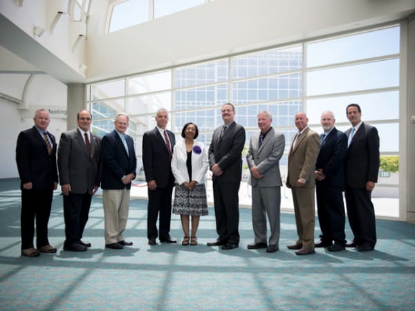 The 10 Public Fleet Hall of Fame inductees pose for a photo after the ceremony. Myrtle Mitchell, Win Mitchell's wife, accepted the plaque on his behalf.