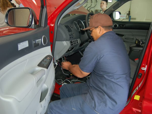 A fleet technician works on one of the city's new Toyota lifeguard vehicles. Toyota loans the city 35 trucks as part of a corporate sponsorship program. The new trucks are the second group of vehicles to arrive and will be used by the city for two years.