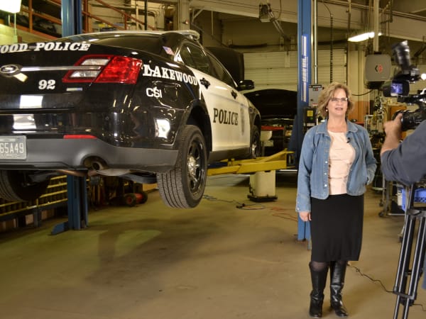Nina Hoffert, fleet manager for the City of Lakewood, talks in front of the camera about the city fleet. She began her career on the administrative side.