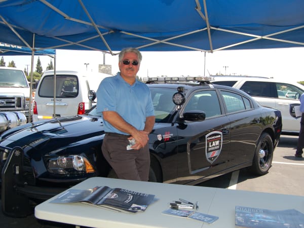 Municipal Equipment Maintenance Association (MEMA) vehicle and equipment showcase: Eric Gierst, regional fleet service manager, Chrysler Group, with a Dodge Charger police vehicle