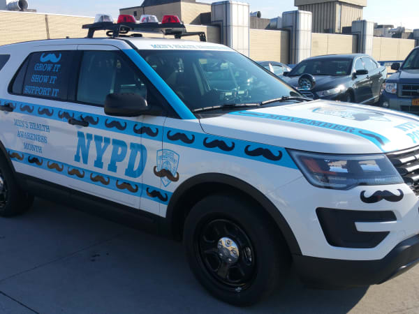 This police car celebrates Movember, which takes place in November and raises awareness for men's health issues.