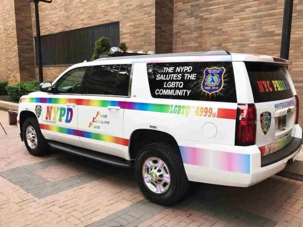 Lesbian, Gay, Bisexual and Transgender Pride Month is celebrated every June, and this wrapped police car celebrates pride.