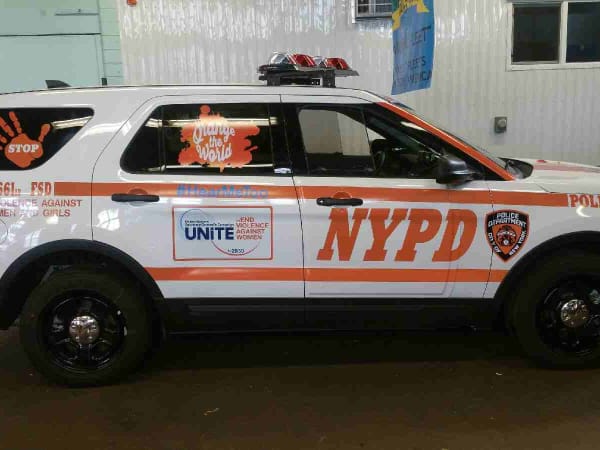 This police car celebrates Orange Day, designated the 25th of every month and amplifies the United Nations' UNiTE to End Violence against Women campaign.