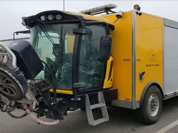 This Cyclone paint and rubber removal machine is used for runway and taxi maintenance at the San Jose Airport.