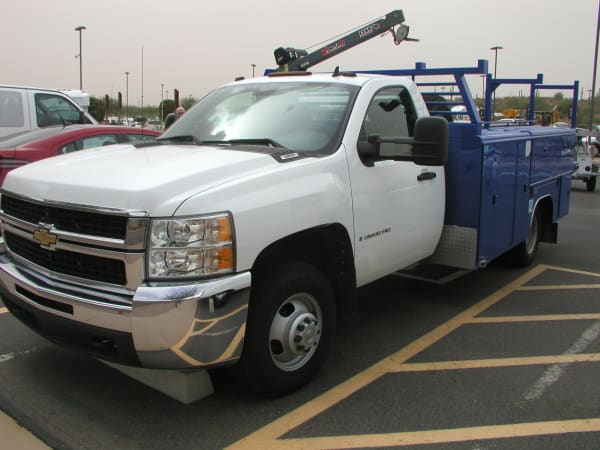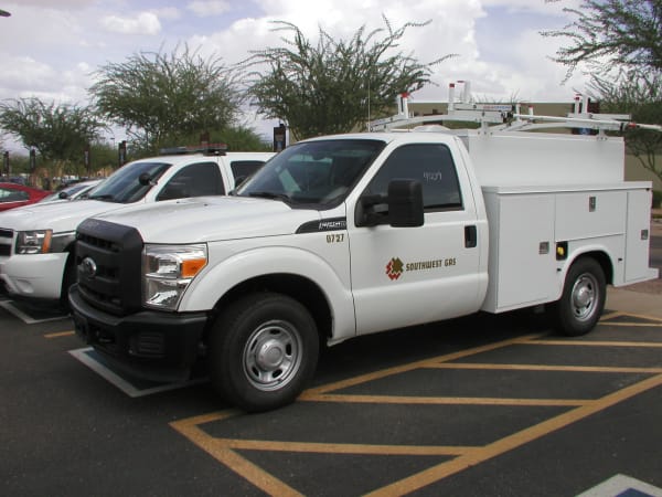 An F-250 from Southwest Gasl. It features a Weather Guard EZ-Glide system on top of the service body,