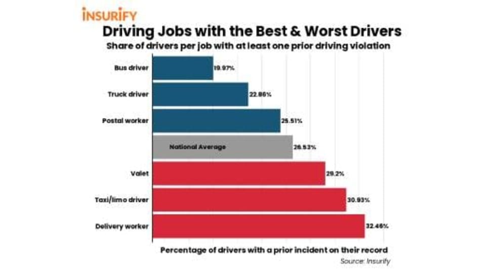 Based on the percentage of drivers with a prior incident on their records, Insurify identifies bus, postal, and truck drivers as the best, and valet, limo, and delivery workers as the worst.