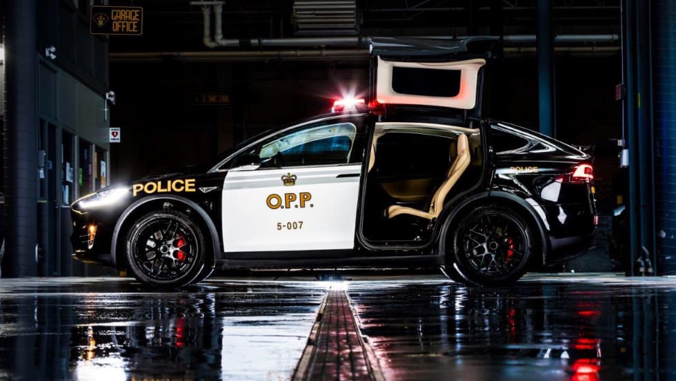 The Ontario Provincial Police (OPP) unveiled a Tesla X pursuit vehicle prototype at the 2018 Canadian International Auto Show in Toronto to represent the future of policing.