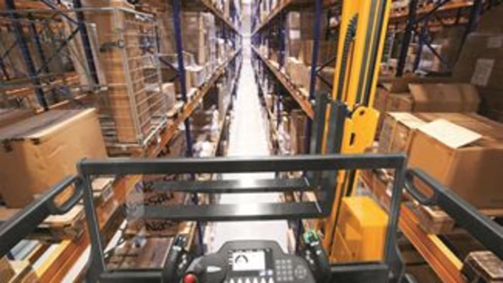 Yale Materials Handling Corporation’s MO25 center rider lift truck eases second level order picking through its fully adjustable electronic power steering, automatic speed reduction in cornering, and suspended platform with an operator-sensing floor mat.