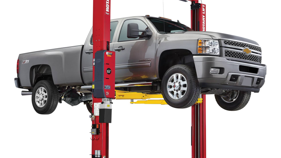 Rotary Lift’s SPO18 heavy-duty two-post lift has a lifting capacity of 18,000 lbs. It comes equipped with a multi-position locking system that engages every four inches and an overhead switch bar to prevent raising a vehicle too high.