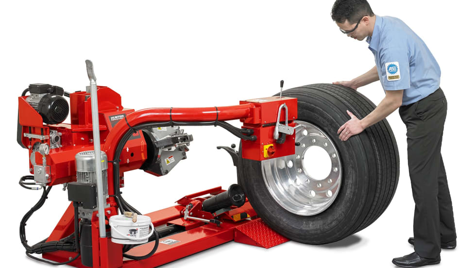 Hunter's new tire changer is made to service tires for trucks, tractors, and other heavy-duty equipment. New features include a hydraulic shuttle for the tool arm and standard skidder clamp.