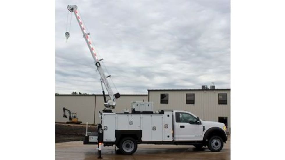 The EH3516 electric-hydraulic crane has a 15,000 ft.-lb. crane rating and maximum lift of 3,500 lbs. It offers 478 degrees of rotation and boom elevation from -13 degrees to +78 degrees.