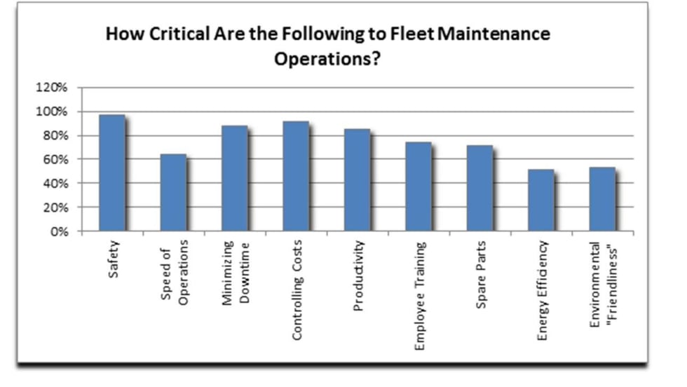 A new study conducted by automotive lift company Stertil-Koni found that the top areas cited as “very important” to fleet maintenance operations in the U.S. and Canada are safety, the top choice of 97% of respondents; controlling costs, at 91%; and minimizing downtime, at 88%.