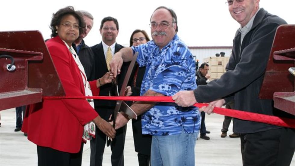 OXNARD, CA - City of Oxnard Councilman Bryan MacDonald and Karen Burnham, assistant city manager, cut the ribbons on two new Fleet Services facilities — a 3,200 sq. foot outside work awning and a 1,600 sq. foot parts store.