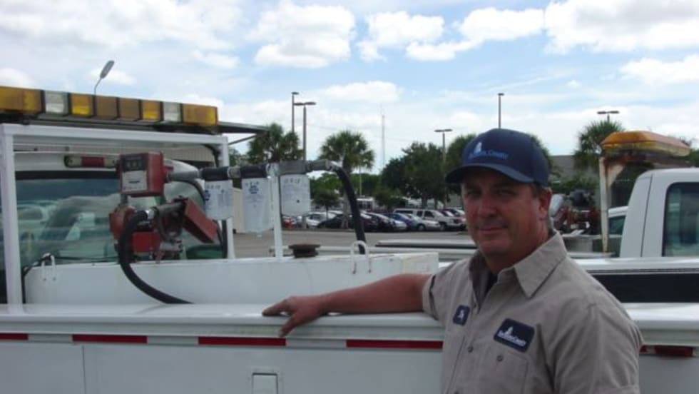 A Sarasota County, Fla., fleet technician has solved the problem of water contamination in auxiliary diesel fuel tanks. Some of the County's off-road assets, fueled by the auxiliary fuel tanks, were losing power and risked engine failure as a result of the water contamination.