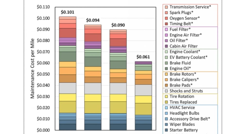 The estimated scheduled maintenance cost for a light-duty battery-electric vehicle is substantially lower than that of a conventional internal combustion engine vehicle, according to a new report by the Argonne National Laboratory.