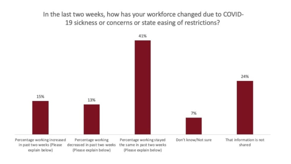 In a Government Fleet survey, 15% of respondents said more employees have come back to work in the past two weeks, while 13% said their workforce has decreased.
