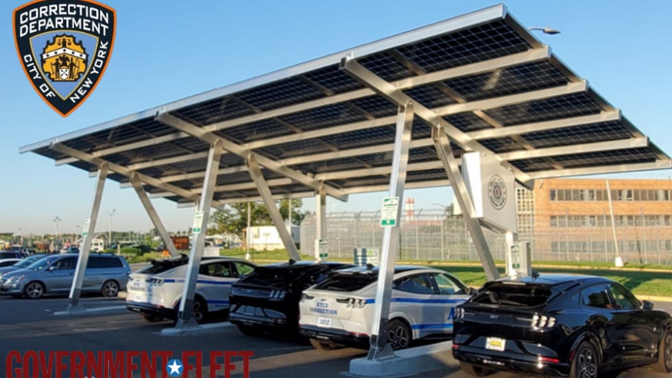 The canopy at Rikers Island is affixed to the grid and the ground, enabling full-time electric charging powered by the sun during the day and the electric grid in the evening.