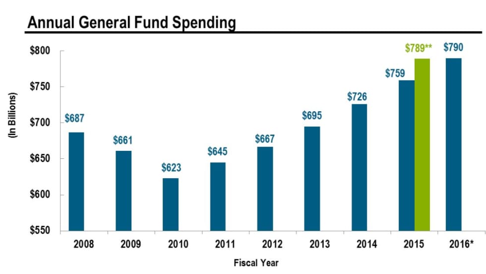 State budgets continue to grow at a moderate pace after several years of a slow recovery from the recession. General fund spending is expected to grow 4.1% in fiscal-year 2016, according to the Fall 2015 Fiscal Survey of States.