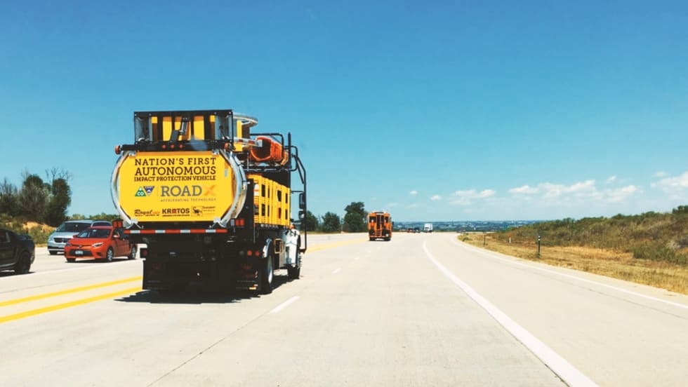 The autonomous truck-mounted attenuator (ATMA) truck is positioned behind road construction crews to protect workers in the event of an impact.