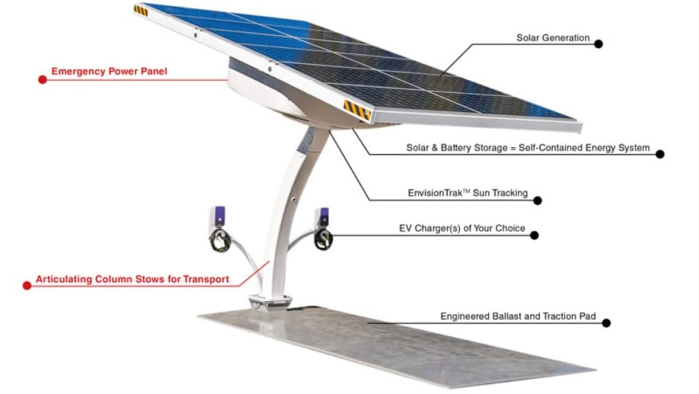 Each EV ARC solar-powered electric vehicle (EV) charging station includes an emergency power panel and can be relocated for city events or in case of emergency power needs.